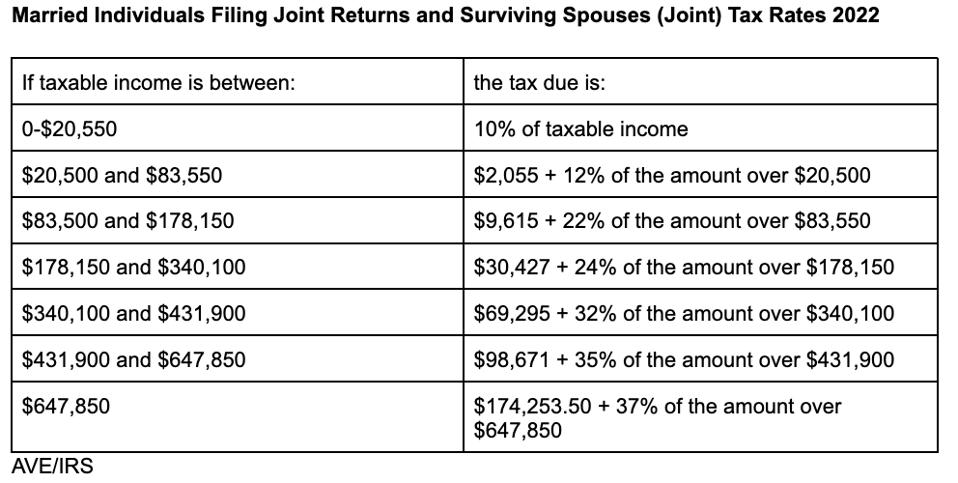 There are seven tax rates in 2022: 10%, 12%, 22%, 24%, 32%, 35% and 37%. Here's how they apply by filing status: