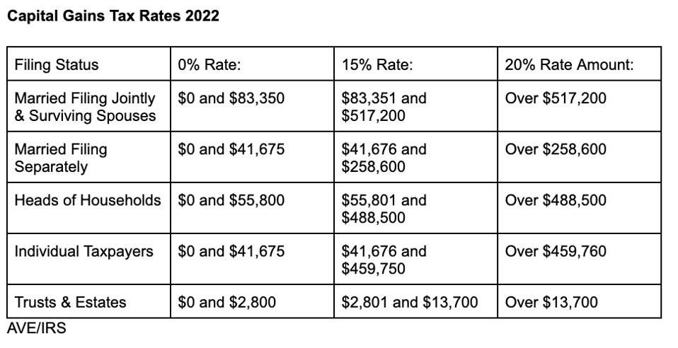 Capital gains tax rates remain the same for 2022, but the brackets for the rates will change. Here’s a breakdown of long-term capital gains and qualified dividends rates for taxpayers based on their taxable income:
