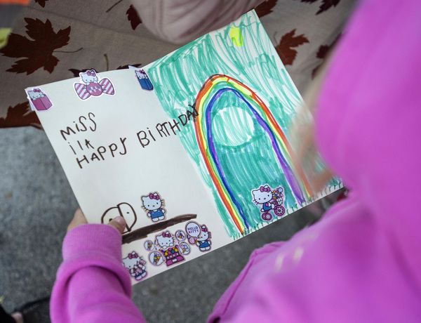A birthday banner, balloons and a table with flowers and gifts were in place before Boyer showed up for work. When she arrived, she was greeted by children who handed her thank you cards.