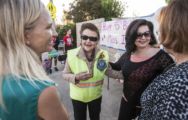 "It gets really crazy here," said Liza Angier, who organized the celebration with fellow parent Shannon Boothroyd. "She allows kids to cross it without any fear. She doesn't get upset with them or the drivers. She does it with such grace."