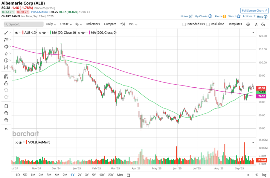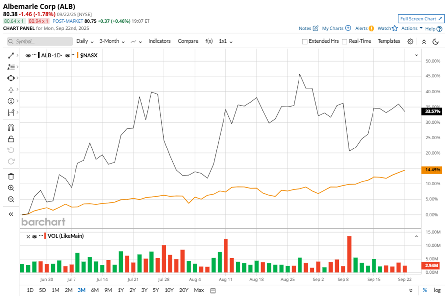 Despite its notable strength, ALB shares slipped 29.4% from their 52-week high of $113.91, achieved on Dec. 9, 2024. Over the past three months, ALB stock has gained 41.9%, considerably outperforming the Nasdaq Composite’s ($NASX) 17.2% gains during the same time frame.