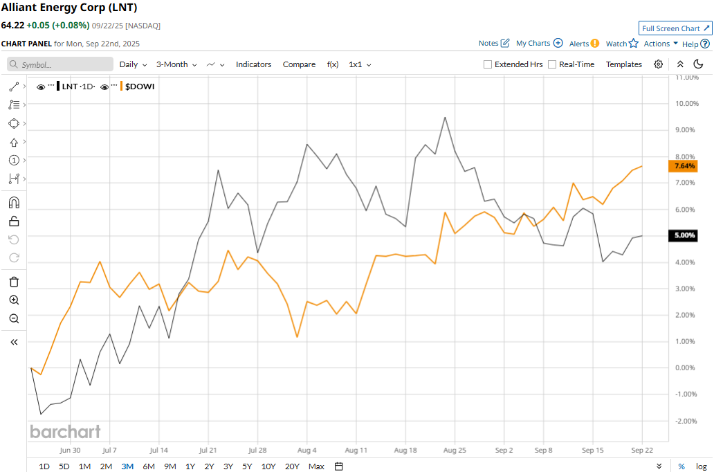 LNT touched its all-time high of $67.11 on Aug. 22 and is currently trading 4.3% below that peak. Meanwhile, the stock has gained 6.1% over the past three months, slightly underperforming the Dow Jones Industrial Average’s ($DOWI) 9.9% surge during the same time frame.