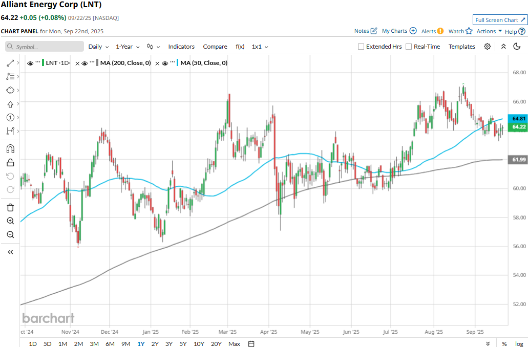 Further, the stock has traded mostly above its 200-day moving average over the past year and above its 50-day moving average since early July, with some fluctuations, underscoring LNT’s uptrend.
