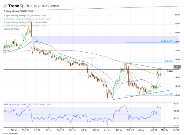 If AT&T can maintain momentum and clear $21, it’s not out of the question that the stock could eventually climb toward $23. There we find the 161.8% extension and a major gap from last May.