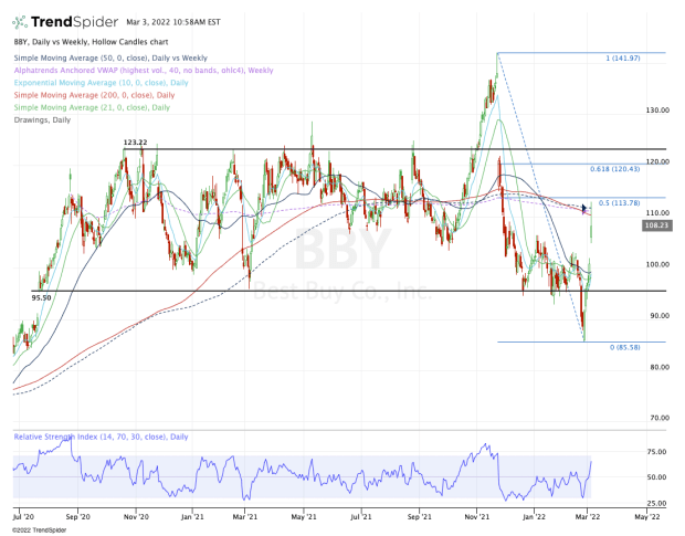 Specifically, Best Buy was pushing above the 200-day and 50-week moving averages, as well as the weekly VWAP measure.