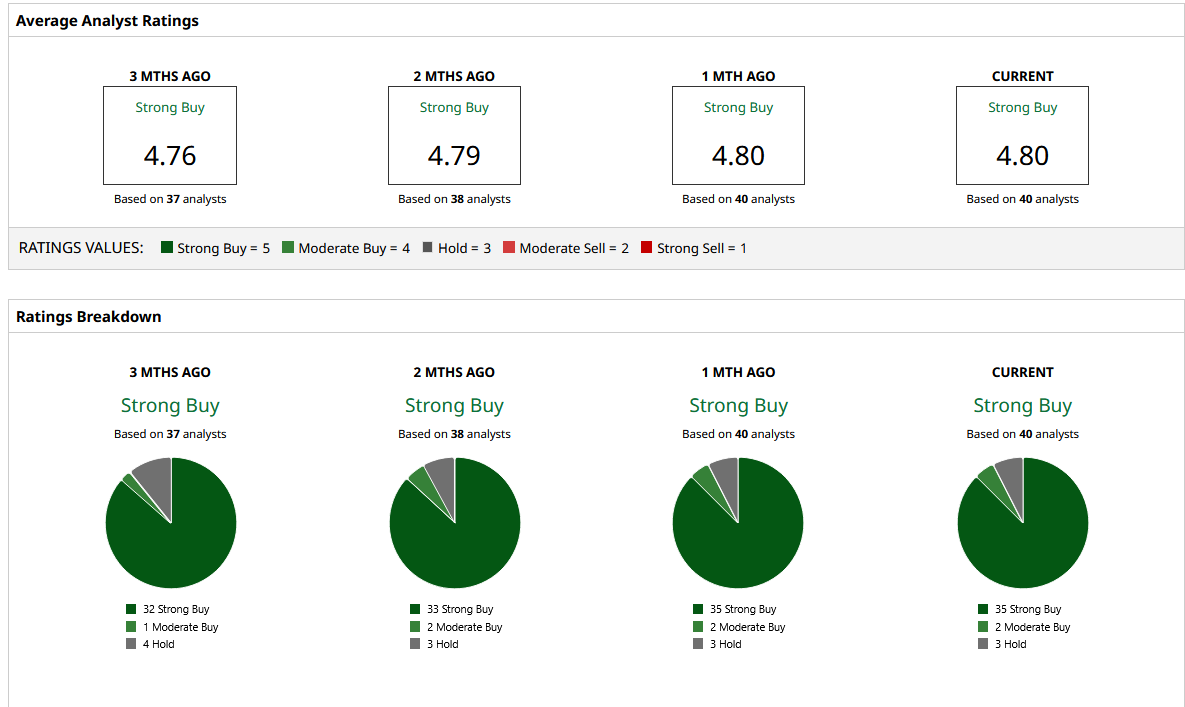 Broadcom is covered by 40 Wall Street analysts, and 35 of them have a “Strong Buy” rating on AVGO stock. Two give it a “Moderate Buy,” and three say “Hold.” No analyst has a “Sell” rating on Broadcom, which goes to show the analysts are not particularly concerned about the high valuation.