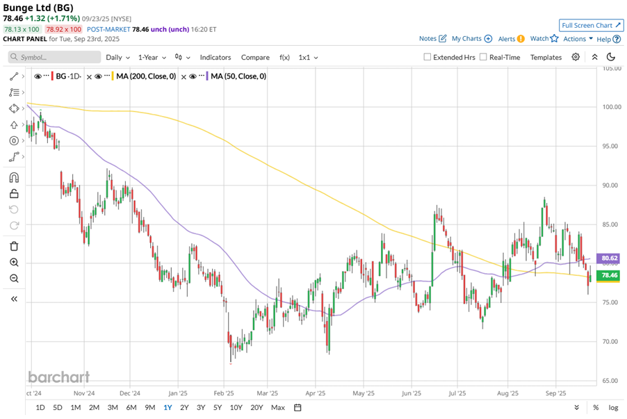 BG’s chart has mostly carried bearish momentum, stuck under its 50-day and 200-day moving averages through the past year. But since early August, the stock clawed its way above both lines, showing signs of life. Recent fluctuations, however, hint that the fight isn’t over, with momentum still trying to prove it’s more than a bounce.