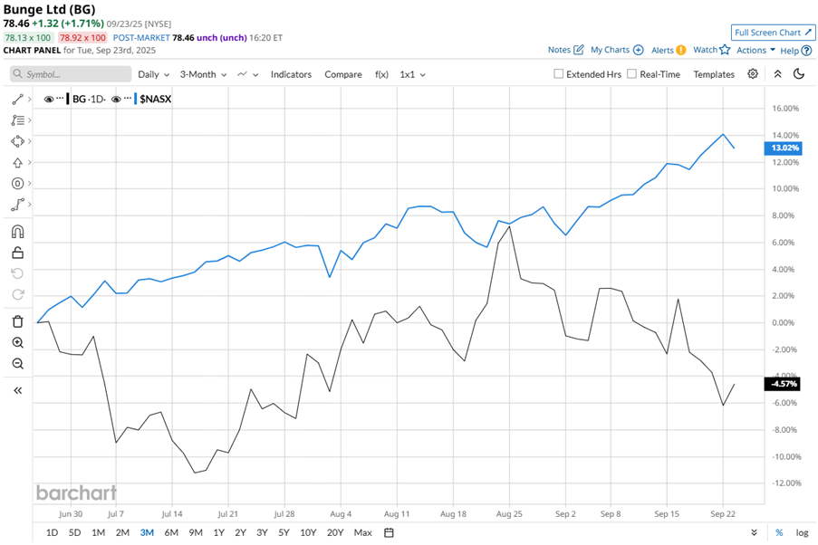 But the stock’s journey has not been smooth lately. BG stock hit its 52-week high of $99.39 last October and now sits about 21.1% below that mark. Over the last three months, shares have slipped 6.8%, while the Nasdaq Composite ($NASX) sprinted ahead with a 15% gain over the same period.