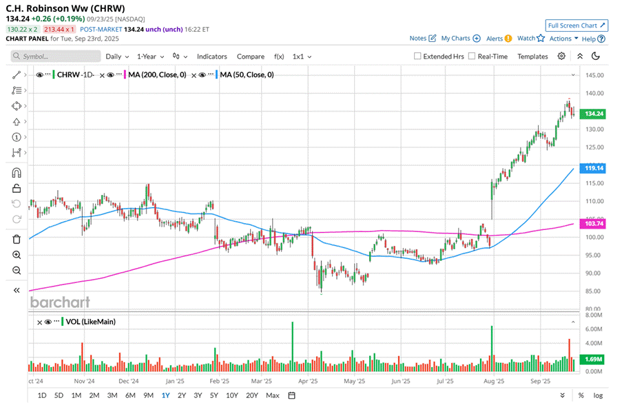 To confirm its bullish trend, CHRW has been trading above its 200-day moving average since late July, and has remained above its 50-day moving average since mid-May, with slight fluctuations.