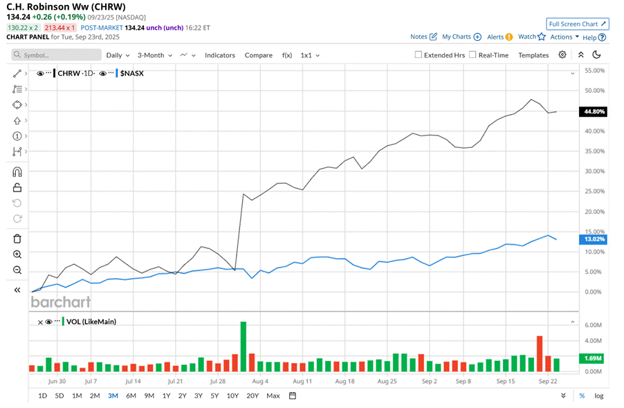 This freight transportation company is currently trading 2.7% below its 52-week high of $138, reached on Sep. 19. Shares of CHRW have rallied 42.9% over the past three months, considerably outperforming the Nasdaq Composite’s ($NASX) 15% return during the same time frame.