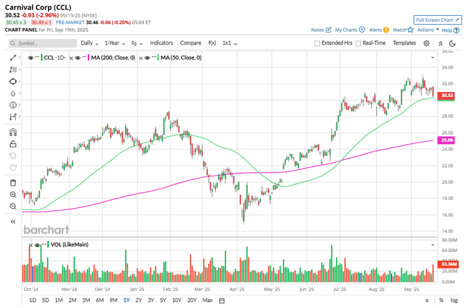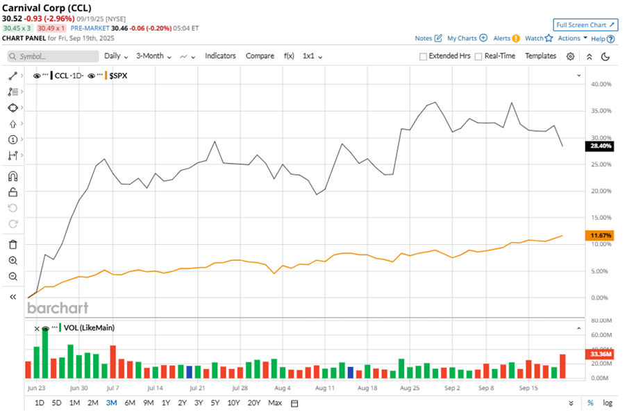 Despite its notable strength, CCL slipped 7% from its 52-week high of $32.80, achieved on Sep. 11. Over the past three months, CCL stock has gained 29.3%, outperforming the S&P 500 Index’s ($SPX) 11.4% gains during the same time frame.