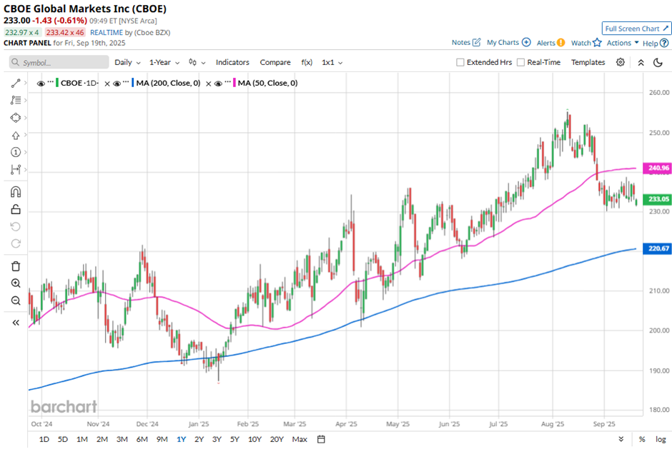 With a market cap of $24.5 billion, Cboe Global Markets, Inc. (CBOE) is one of the world’s largest exchange operators and a leader in ETP trading. Through its subsidiaries, it offers trading across multiple asset classes, including options, futures, equities, FX, and digital assets, spanning North America, Europe, and Asia Pacific.