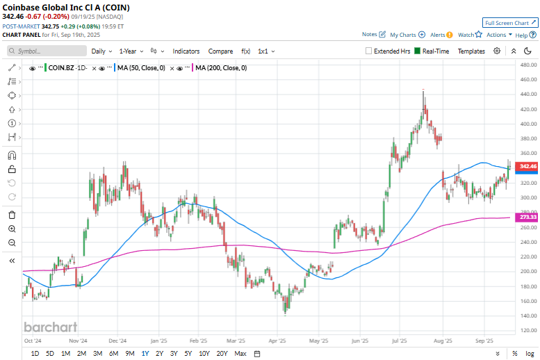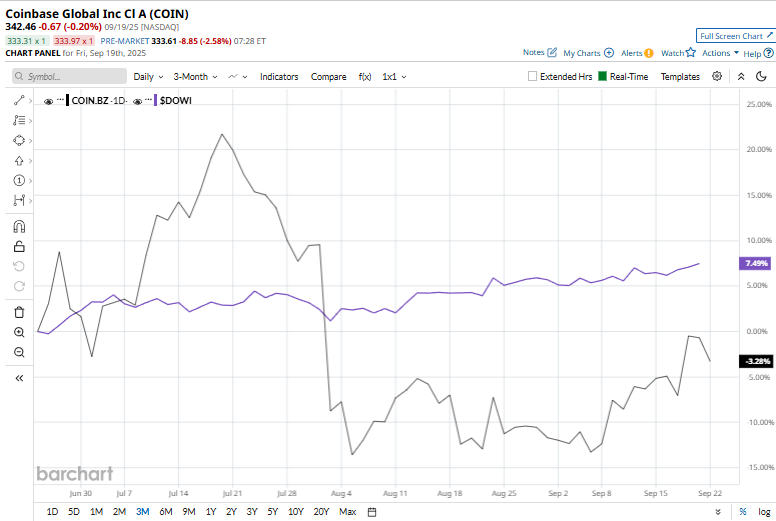 Despite its strengths, the stock has plunged 23% from its 52-week high of $444.64 touched on Jul. 18. Over the past three months, COIN stock has grown 16%, outperforming the S&P 500 Index ($SPX), which has returned 11.4% over the same time frame.