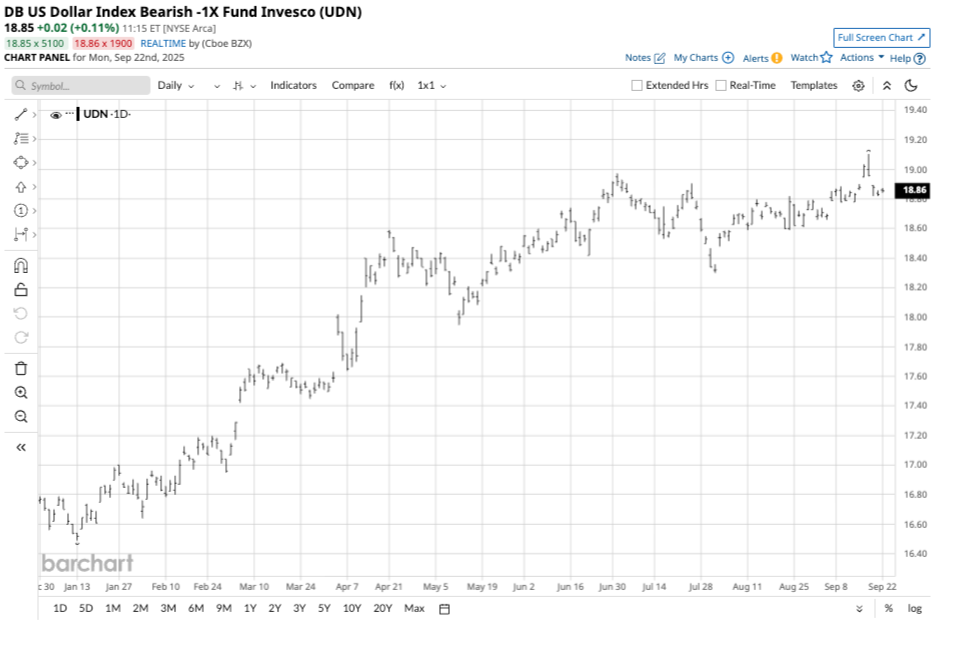 The Invesco DB U.S. Dollar Bearish -1X Fund (UDN) is an unleveraged ETF product that appreciates when the dollar index declines. At $18.85 per share, UDN had over $153.46 million in assets under management. UDN trades an average of over 173,800 shares daily and charges a 0.77% management fee. The dollar index declined 12.66% from its 2025 high to its low.