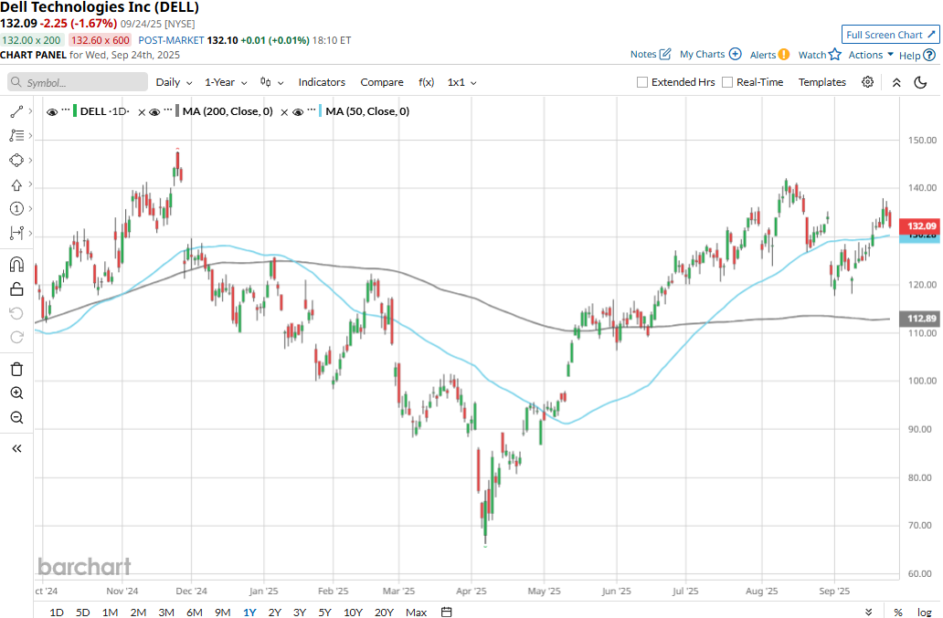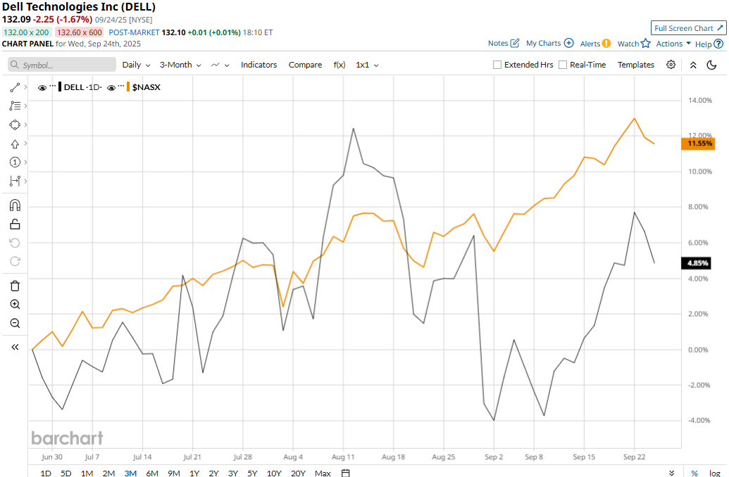 Dell touched its 52-week high of $147.66 on Nov. 25, 2024, and is currently trading 10.5% below that peak. Meanwhile, the stock has gained 9.5% over the past three months, slightly underperforming the Nasdaq Composite’s ($NASX) 13% surge during the same time frame.