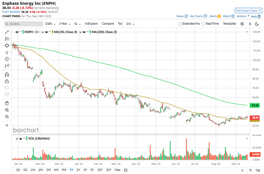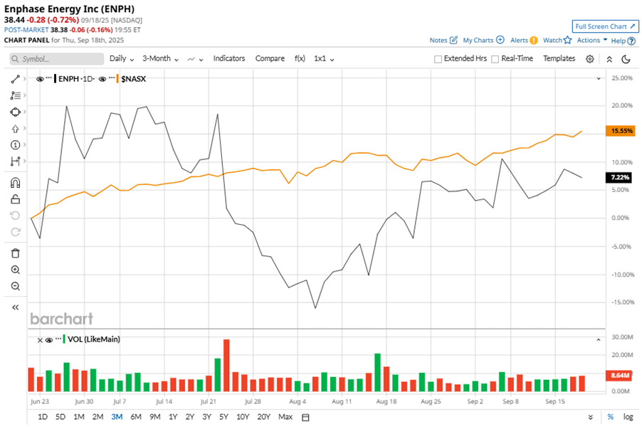Despite its notable strength, ENPH shares slipped 69.1% from their 52-week high of $124.40, achieved on Sep. 19, 2024. Over the past three months, ENPH stock has gained 5.7%, underperforming the Nasdaq Composite’s ($NASX) 15% gains during the same time frame.