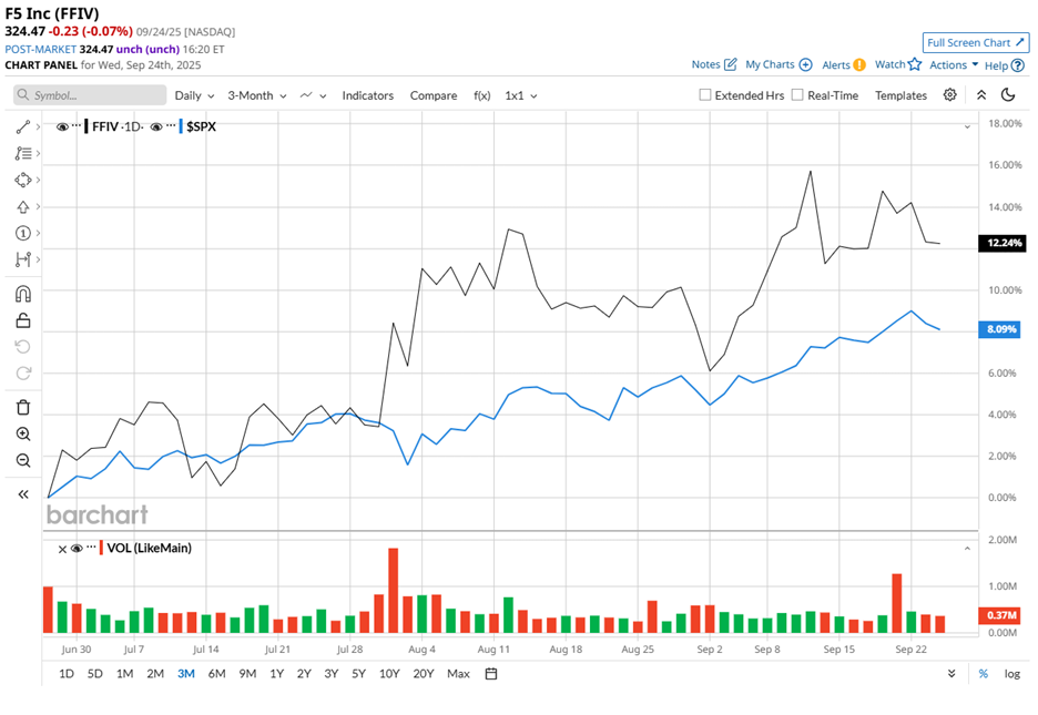 The longer horizon underscores the same momentum. Over the past 52 weeks, FFIV stock surged 45.1%. In 2025 alone, it has already climbed 29%. By comparison, the S&P 500 rose 15.8% over the past 52 weeks and 12.9% on a year-to-date (YTD) basis. The contrast highlights consistent outperformance against a major benchmark.