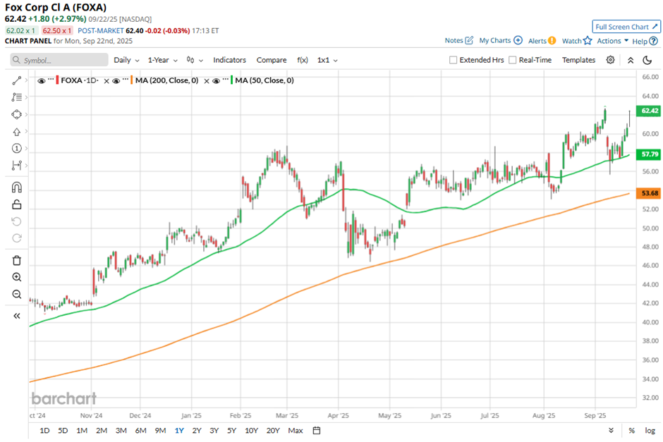 With a market cap of $27 billion, Fox Corporation (FOXA) is a leading U.S.-based media company that delivers news, sports, and entertainment content through its well-known brands, including FOX News, FOX Sports, the FOX Network, and Tubi. Operating across four segments: Cable Network Programming, Television, Credible, and FOX Studio Lot, the company reaches audiences through broadcast, cable, digital platforms, and production services.