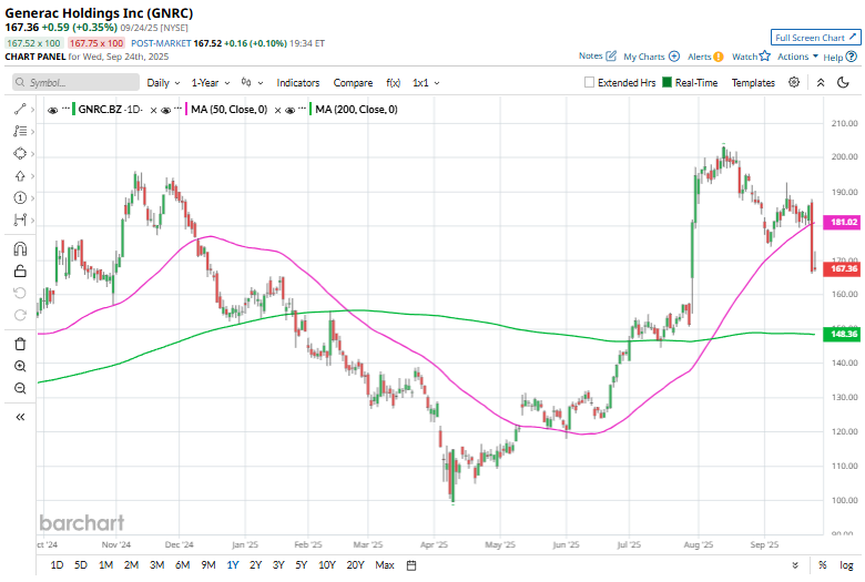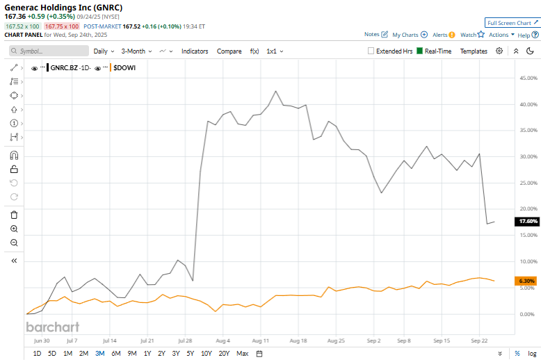 The Waukesha, Wisconsin-based company currently trades 17.7% below its 52-week high of $203.25 recorded on Aug. 13. GNRC's stock has gained 23.1% over the past three months, outpacing the broader Dow Jones Industrial Average’s ($DOWI) 7% rise during the same time frame.