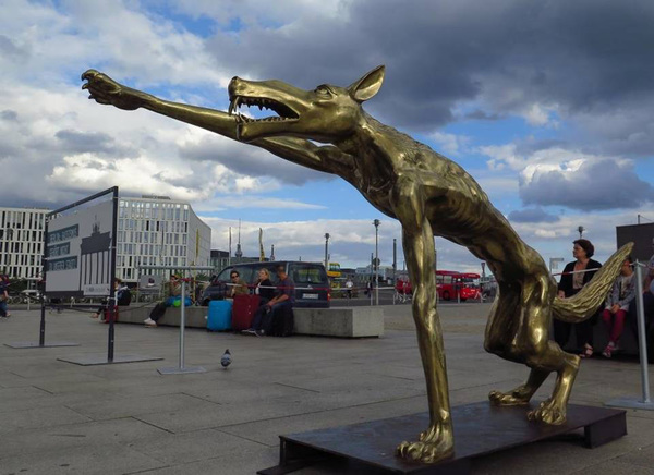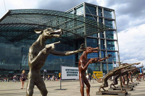 For two weeks in August, outside Berlin's Hauptbahnhof central train station, an open air exhibit of 60 statues of stylized wolves is titled "Are the wolves back? Art against hatred and violence." The bronze or iron statues _ each at least 2 yards long _ show wolves in Nazi salutes, bunching to lunge, stretched out in a full attack. One group of statues, however, is standing upright, aiming pistols, and is titled "NSU man."
