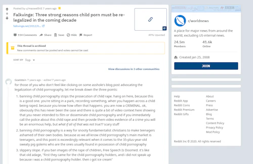 The topics the account does often wade into include — but are not limited to — the ages of sexual consent in various regions, the supposed overreach of sex offender laws, pedophilia, graphic violence against children, "over-zealous" child protection legislation, child psychology, and advocating for the legalization of child porn. On the rare instance when presented with news stories about real-life instances of pedophilia, u/MaxwellHill seems to contradict themselves and lash out against offenders. Users have hand-waved this behavior, claiming that often sex offenders hold themselves to different standards, justifying their crimes through a variety of mental backflips.