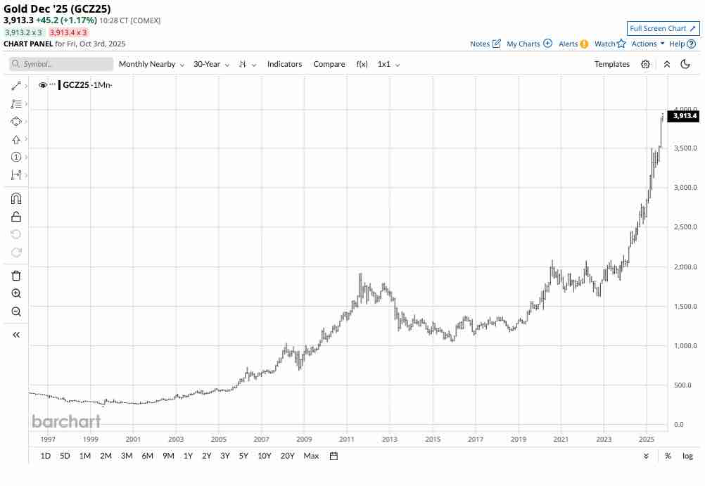 Gold continues to reach new highs in October, with the December COMEX futures price hitting a high of $3,923.30 per ounce. Gold’s bullish trend since the low in 1999 continues, and the sky appears to be the limit for the leading precious metal. Meanwhile, the higher gold rises, the odds of a correction increase.