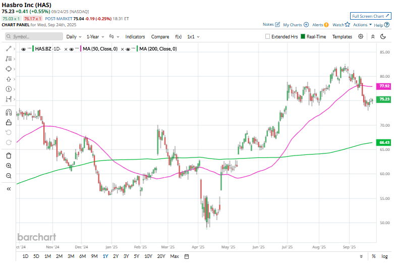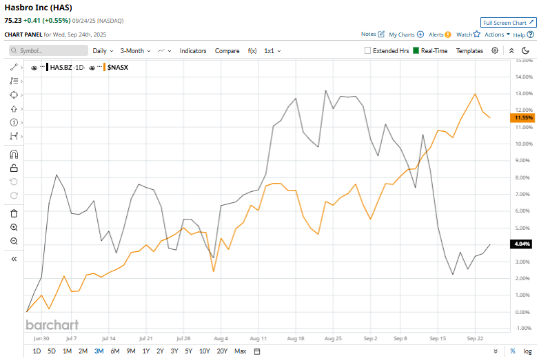 Hasbro’s stock performance has been a mixed bag. It has dropped 8.5% from its 52-week high of $82.19 met on Aug. 27. Shares of HAS have gained 3.7% over the past three months, underperforming the broader Nasdaq Composite’s ($NASX) 13% rise over the same time frame.