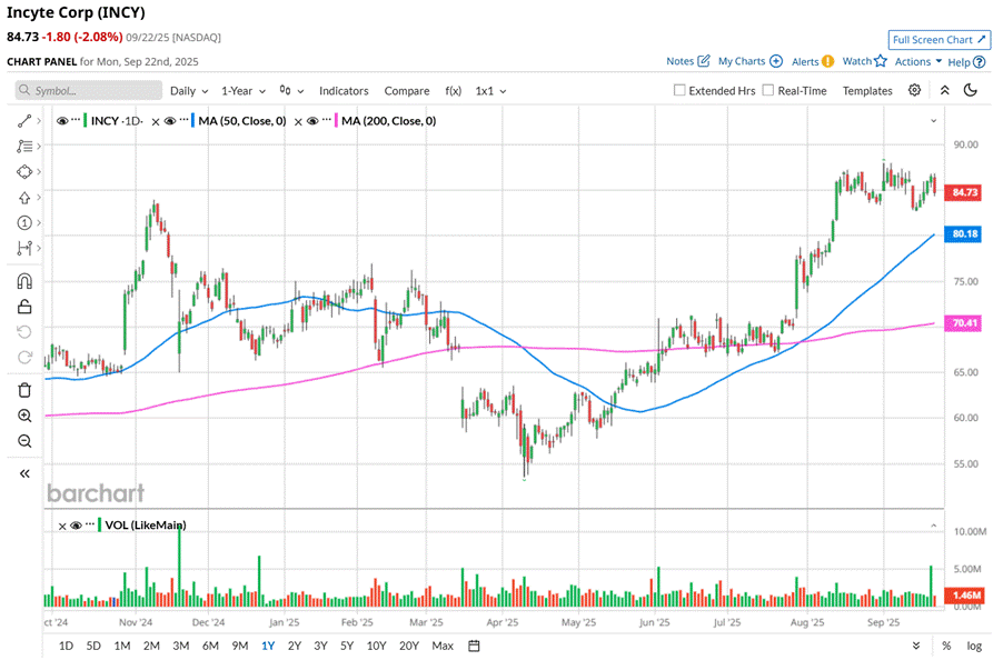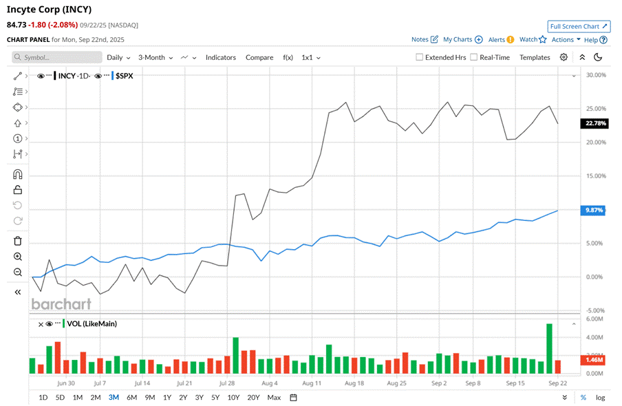 This biopharmaceutical company is currently trading 3.7% below its 52-week high of $87.99, reached on Sep. 4. Shares of INCY have surged 23.8% over the past three months, outperforming the S&P 500 Index’s ($SPX) 12.2% return during the same time frame.