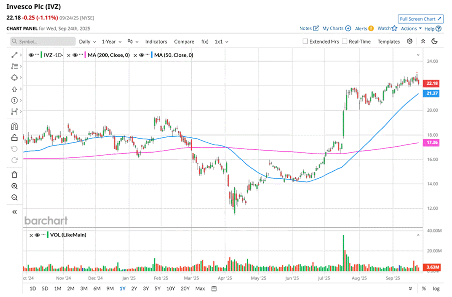 To confirm its bullish trend, IVZ has been trading above its 200-day moving average since early July, and has remained above its 50-day moving average since early May.
