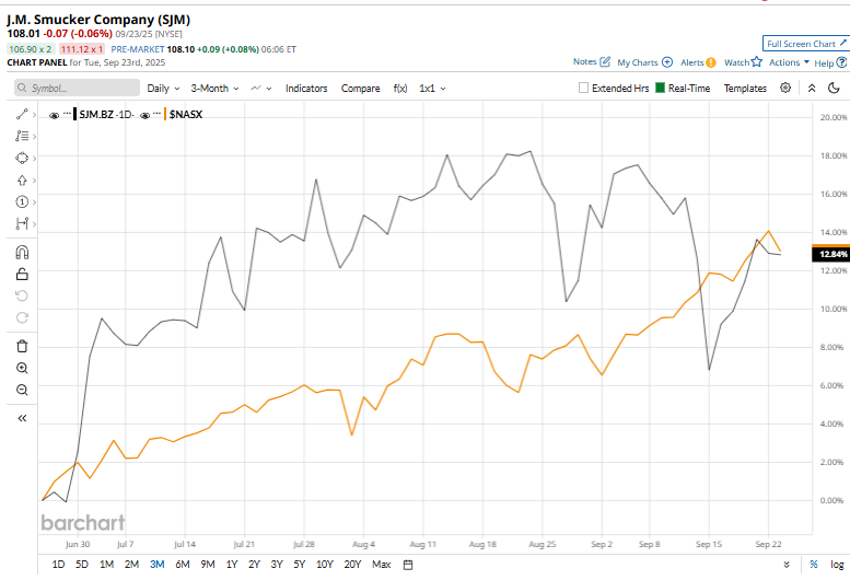 However, SJM has been trading 13.9% below its 52-week high of $125.42, met on Nov. 26, last year. However, the stock has surged 11% over the three months, underperforming the broader Nasdaq Composite’s ($NASX) 15% rise over the same time frame.