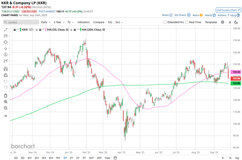 With a market cap of $131.2 billion, KKR & Co. Inc. (KKR) is a global investment firm that specializes in private equity, real estate, credit, and infrastructure investments. The firm focuses on a wide range of strategies including leveraged buyouts, growth equity, distressed situations, and impact investing across diverse sectors and geographies.