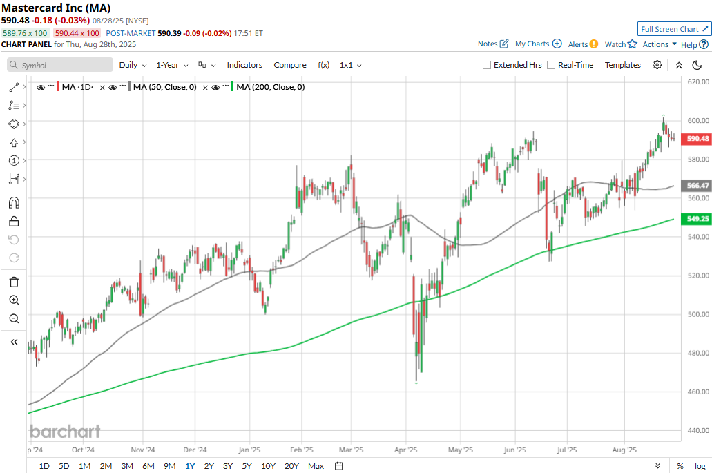 To confirm the uptrend, Mastercard’s stock has traded mostly above its 200-day moving average over the past year, with some fluctuations, and has consistently remained above its 50-day moving average since early August.