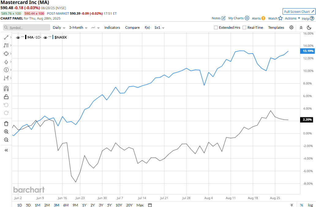 Mastercard touched its all-time high of $601.77 on Aug. 22 and is currently trading 1.9% below that peak. MA stock has observed a 2.5% uptick over the past three months, notably lagging behind the Nasdaq Composite’s ($NASX) 13.6% surge during the same time frame.