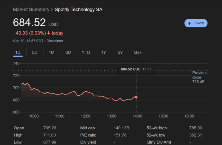 Since its 52-week high of $785 in July 2025, Spotify (SPOT) has experienced a pullback to approximately $684.52 as of 30 September 2025. The pullback appears more a function of headline risk than structural weakness: