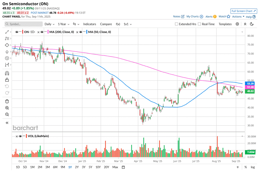 To confirm its bearish trend, ON has been trading below its 200-day moving average over the past year, with slight fluctuations, and has remained below its 50-day moving average since early August.