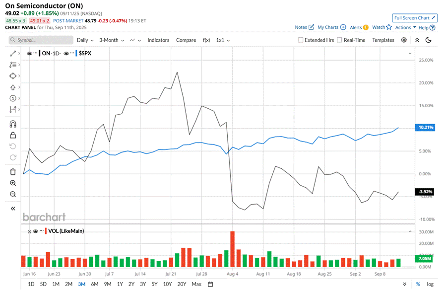 Despite its notable strength, this semiconductor company has slipped 35.6% from its 52-week high of $76.06, reached on Oct. 30, 2024. Moreover, shares of ON have declined 5.3% over the past three months, considerably underperforming the S&P 500 Index’s ($SPX) 9.4% return during the same time frame.