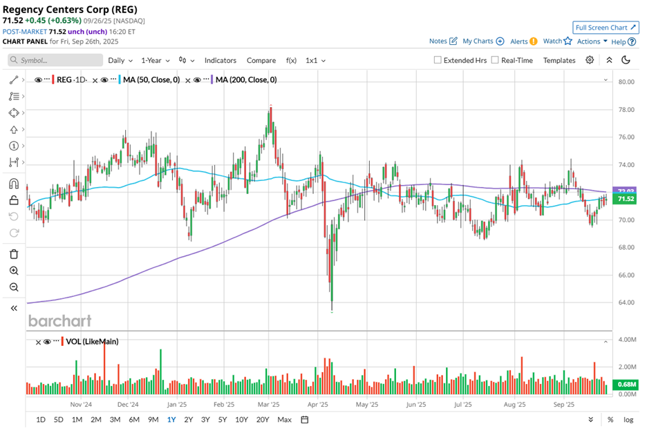 REG trades at $71.52, caught in a tug-of-war. Over the past year, the stock repeatedly crossed both the 50-day and 200-day moving averages, flashing mixed signals. The 50-day MA swings have sparked short-lived rallies, but repeated rejections near the 200-day MA since April 2025 cap upside strength. Over the past year, price action has oscillated between bullish surges and bearish pullbacks, leaving the stock in a technically indecisive zone.