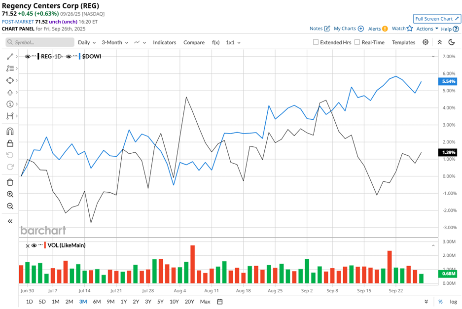 However, the scene in market terms is more candid than coy. Shares of Regency fell 8.5% from its 52-week high of $78.18 in March. Yet REG stock has eked out a 1.4% gain over the past three months. To put that into perspective, the Dow Jones Industrial Average ($DOWI) waltzed higher by 6.6% in the same stretch.