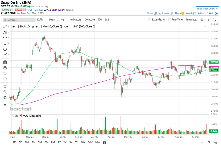 To confirm the bullish trend, SNA has been trading above its 50-day moving average since early July, with some fluctuations. The stock is trading above its 200-day moving average since mid-September.