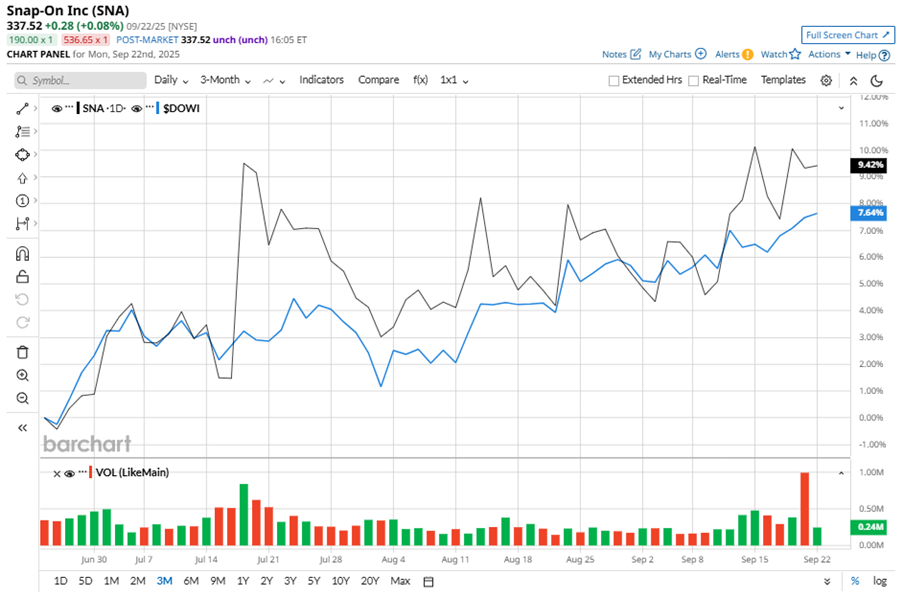 Despite its notable strength, SNA shares have slipped 9.7% from their 52-week high of $373.90, achieved on Nov. 27, 2024. Over the past three months, SNA stock has gained 10.4%, outperforming the Dow Jones Industrials Average’s ($DOWI) 9.9% gains during the same time frame.