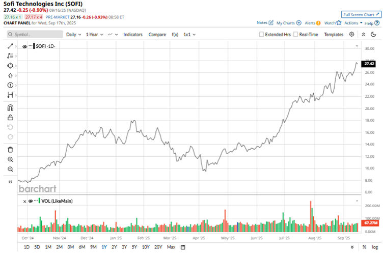 Over the past 52 weeks, SOFI stock has gained 247%, while it is up 83% year-to-date (YTD). The stock reached its highest level of $28.58 on Sept. 18. SOFI first started trading on the Nasdaq on June 1, 2021 following a merger with blank-check company Social Capital Hedosophia Corp V. Currently, SOFI stock is down only 1.6% from its recent high.