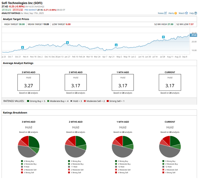 Wall Street analysts are taking a cautious stance on SoFi Technologies, with a consensus “Hold” rating overall. Of the 24 analysts rating the stock, five analysts rate it a “Strong Buy,” two analysts suggest a “Moderate Buy,” 12 analysts have a “Hold” rating, two analysts give a “Moderate Sell” rating, and three analysts have a “Strong Sell” rating. The consensus price target of $19.89 represents 30% potential downside from current levels.