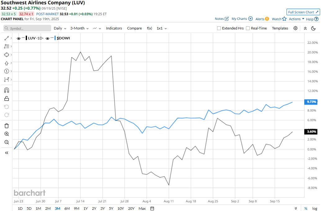 Southwest touched its two-year high of $37.96 on Jul. 17 and is currently trading 14.3% below that peak. Meanwhile, the stock has gained 4.4% over the past three months, lagging behind the Dow Jones Industrial Average’s ($DOWI) 9.8% surge during the same time frame.