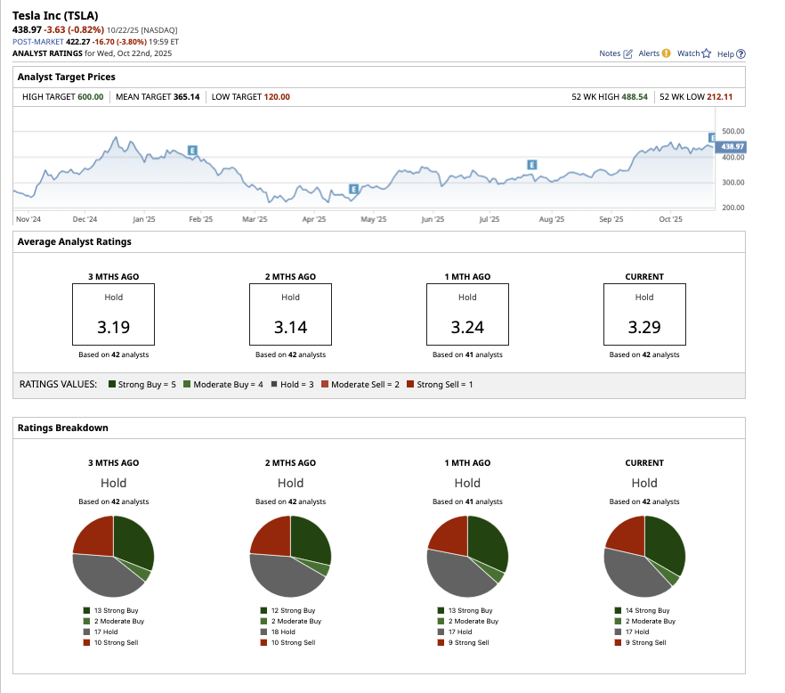 Overall, Wall Street remains skeptical due to Tesla’s steep valuation and continues to rate the stock a “Hold.” Of the 42 analysts covering the stock, 14 recommend it as a “Strong Buy,” two as a “Moderate Buy,” 17 as a “Hold,” and nine as a “Strong Sell.” Tesla has surpassed its average analyst target price of $365.14. The high price estimate of $600 implies that the stock can rise by 37% in the next 12 months.