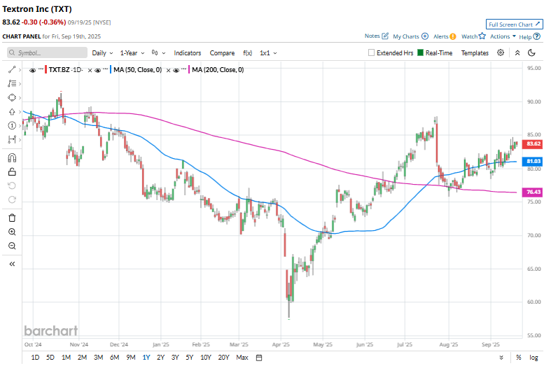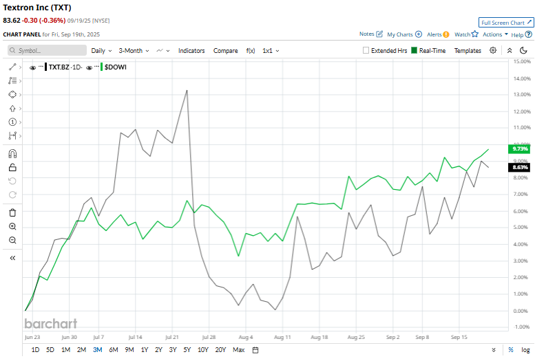 Textron stock has declined 8.4% from its 52-week high of $91.30. TXT stock has risen 9.2% over the past three months, slightly lagging the broader Dow Jones Industrial Average’s ($DOWI) 9.8% rise during the same time frame.
