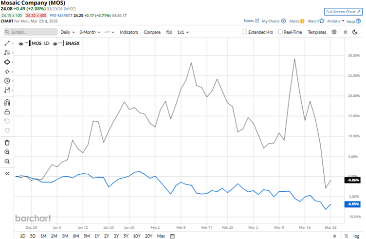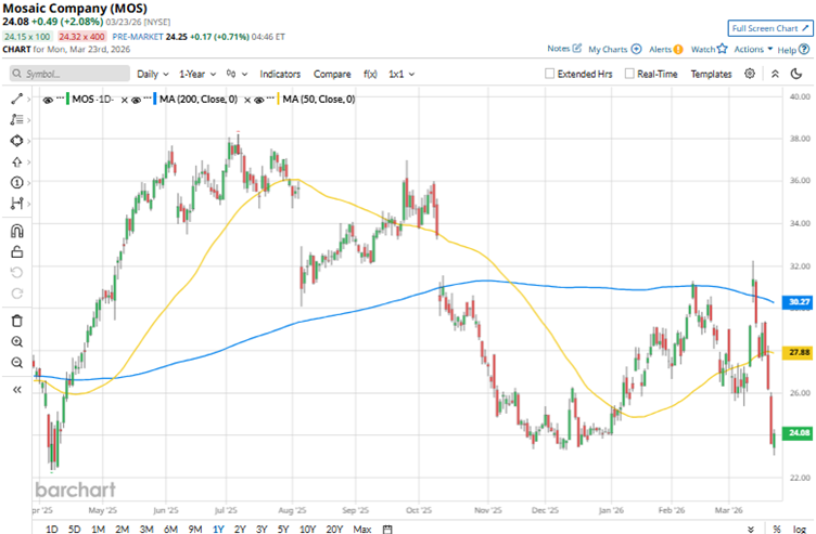The company’s stock reached a 52-week high of $38.23 in July 2025, but is down 37% from that level. The stock has been facing some issues mainly because fertilizer-sector profits and margins have disappointed, amid subdued demand, softer sales volumes, and higher input costs that are squeezing earnings amid the geopolitical turmoil. Over the past three months, Mosaic’s stock has been down marginally. On the other hand, the broader Nasdaq Composite ($NASX) index is down 6.9% over the same period.