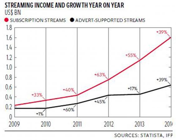 But now some see a stabilisation. Digital revenues are rising rapidly thanks to streaming royalties and legal downloads, through platforms such as iTunes. Digital revenues overtook sales of physical items such as CDs for the first time in 2014. Streaming revenue is around $2bn a year, up from zero in 2009.
