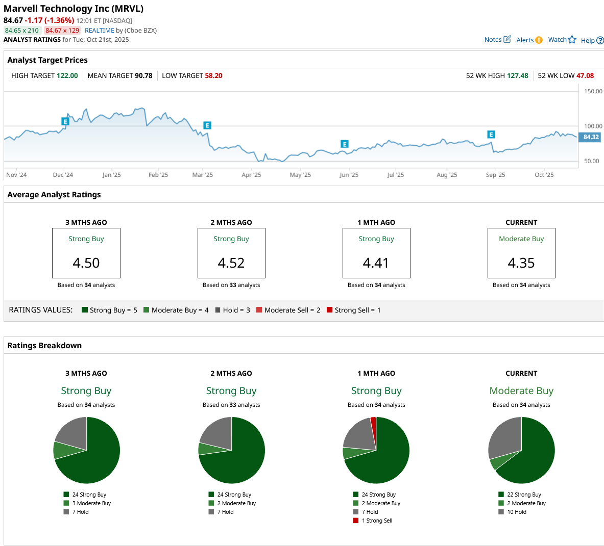 Overall, analysts remain strongly bullish about MRVL stock. Out of the 34 analysts covering it, 22 have rated MRVL a “Strong Buy,” two have a “Moderate Buy” recommendation, and 10 suggest a “Hold.”
