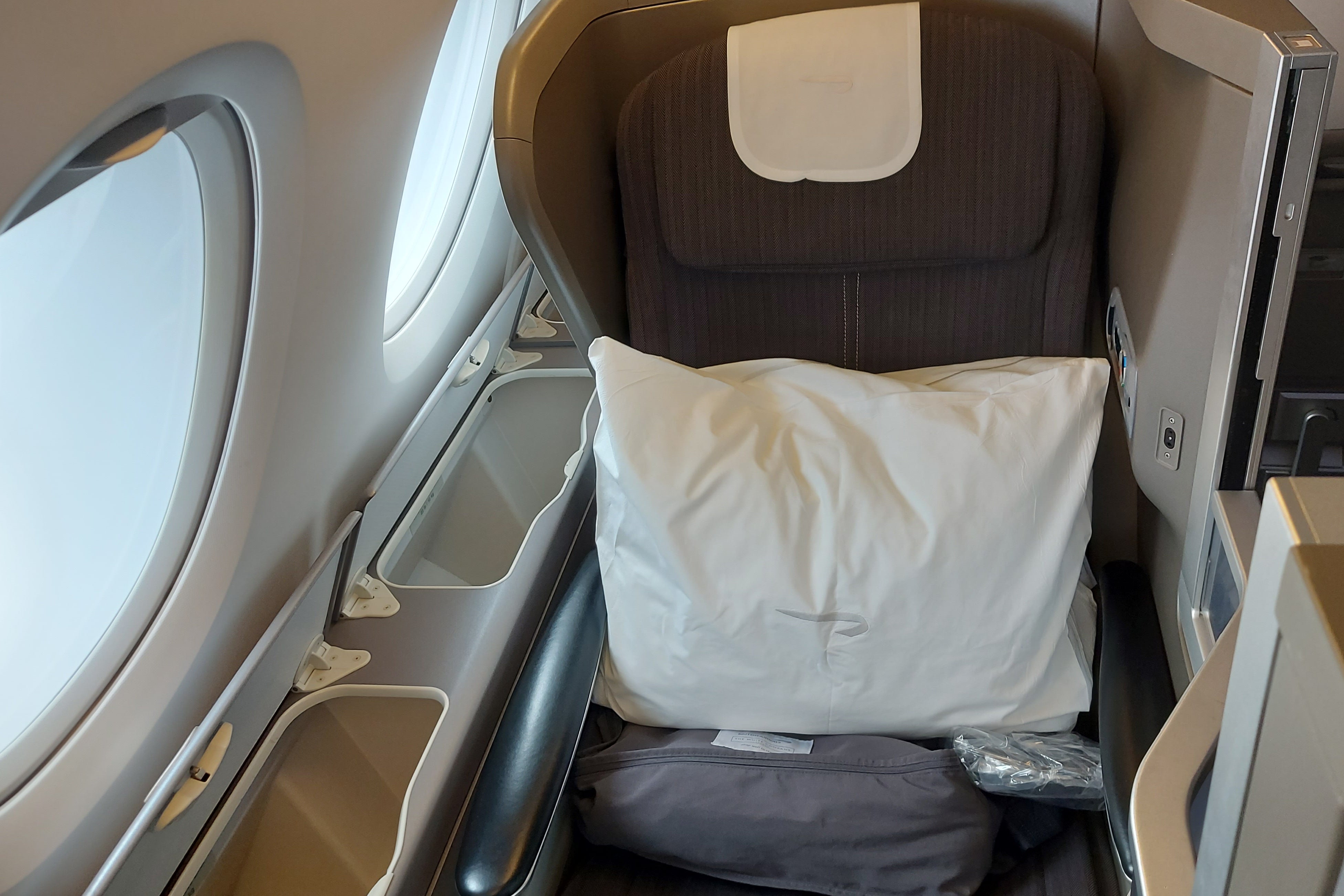 Throw in sound ergonomics — the seat controls are reached without strain, and a USB-C port and hand controller just need a slight twist to access — good quality bedding and a stylish, reusable amenity kit, both by White Company, and you have a set-up that feels reassuringly premium.