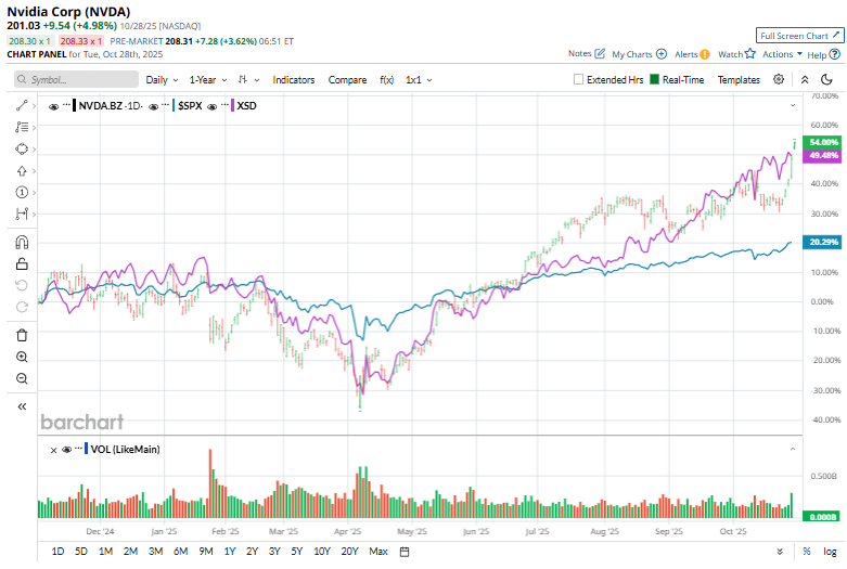 Even among its semiconductor peers, NVIDIA still wears the crown. The stock has slightly surpassed the industry-focused SPDR S&P Semiconductor ETF (XSD), which has gained about 42% over the past year and 41% on a YTD basis.